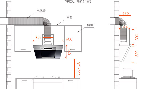 2、為方便煙機(jī)安裝,櫥柜需預(yù)留一定空間,在產(chǎn)品尺寸的基礎(chǔ)上,建議多預(yù)留30㎜