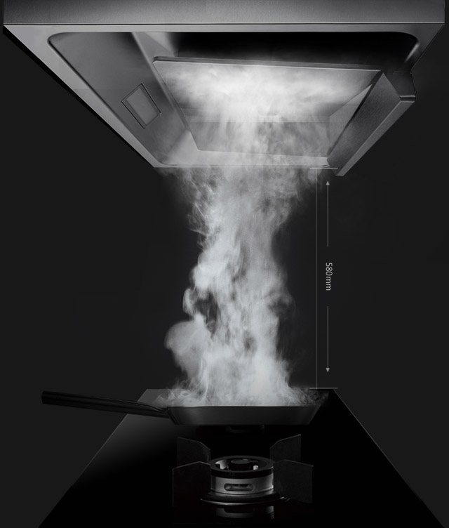 讓我們有了一個絕妙的發現,烹飪時,油煙會有炸起、升騰、擴散三個階段。而距離灶臺580mm黃金控煙區,恰好是油煙升騰和擴散的臨界點, 更是決定吸油煙效果的核心關鍵。
