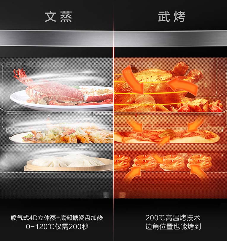 與此同時,科恩智能變頻大吸力集成灶5.0KW強(qiáng)勁火力,大火夠猛,小火夠穩(wěn),雙聚能環(huán)設(shè)計,熱量不流失,讓愛爆炒的用戶充分享受大火力帶來的極致體驗。可隨心調(diào)節(jié)火力大小,大火猛、小火穩(wěn),爆炒、蒸煮、燜燉等各種烹飪方式都能得心應(yīng)手,給用戶們帶來暢爽的烹飪體驗,讓美食一觸即發(fā),美味全新升級!為解決更多烹飪需求,科恩智能變頻大吸力集成灶下方搭載62L黃金容量蒸烤箱,4D立體直噴式蒸烤模式,受熱跟更均勻,頂部不滴水,智能恒溫蒸烤,多種食物不串味并保證美食色澤亮麗,營養(yǎng)不流失!