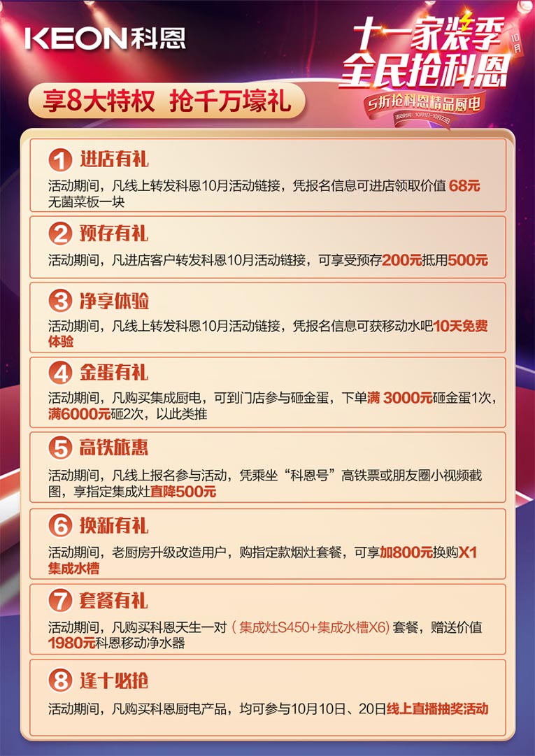 10月20日19:00鎖定科恩直播間,十一家裝季全民搶科恩,10月19日前購(gòu)買(mǎi)科恩廚電用戶(hù)均可參與抽獎(jiǎng),千萬(wàn)壕禮免費(fèi)抽取準(zhǔn)時(shí)開(kāi)搶?zhuān)。?