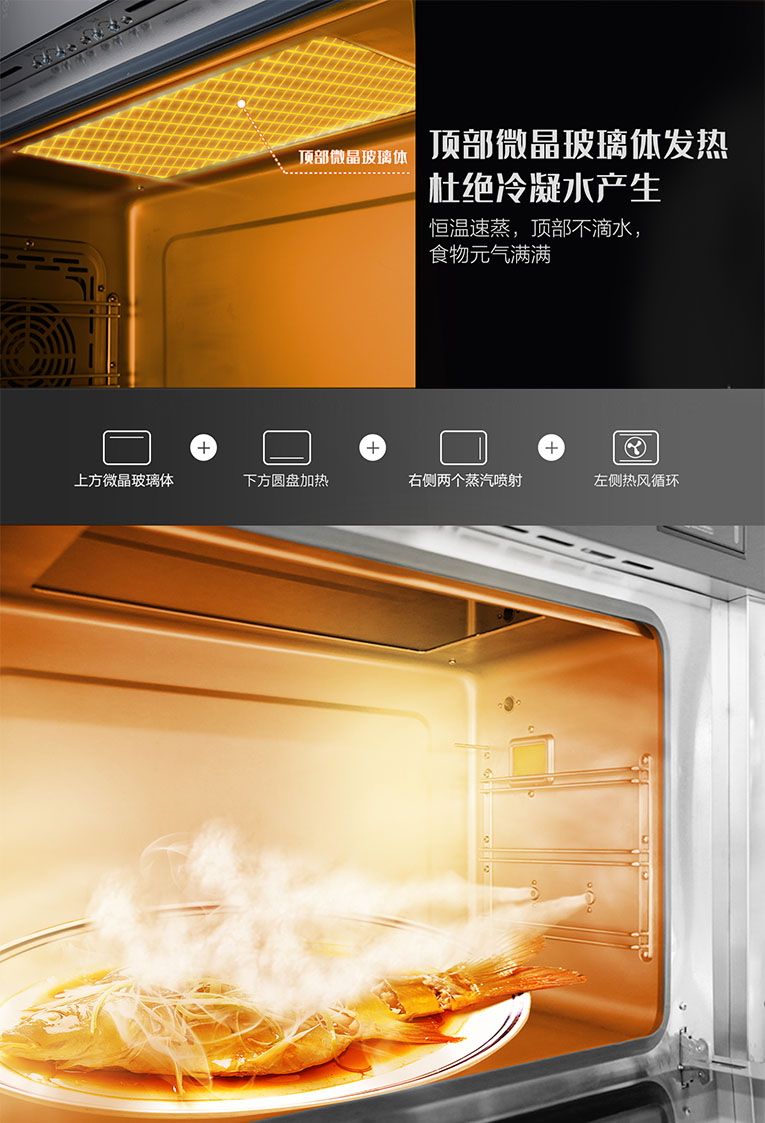 “蒸”作為中國傳統且廣泛使用的烹飪手段,是公認的健康飲食之道,科恩集成烹飪中心S350蒸消款集成灶,頂部微晶加熱+ 底部陶瓷加熱盤,雙孔大蒸汽100%極速穿透,充分保留食物原汁原味,蒸出美味蒸出鮮。