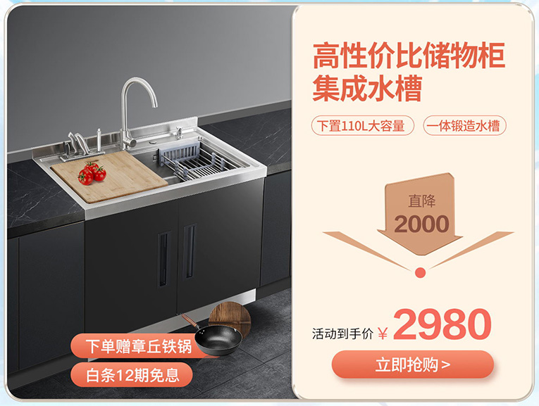 雙11感恩回饋款,多功能一體集成水槽,釋放廚房大空間,科恩X1多功能集成水槽,雙11活動期間直降2000,活動到手價2980。