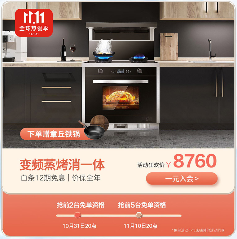 科恩集成灶雙11爆款搶免單,新一代變頻蒸烤消一體集成灶,八大烹飪模式蒸烤合一,集成灶選變頻,更省心!D151X變頻大吸力蒸烤消一體集成灶雙11狂歡價8760元,11月10日20點前5臺下單就有機會免單;
