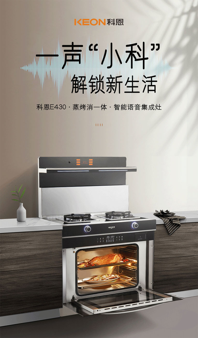 想要煙火氣,但不想要油煙味,“你好科恩”油煙凈吸,智能語音智控烹飪,解鎖無接觸式樂趣,科恩E430智能語音蒸烤消一體集成灶。