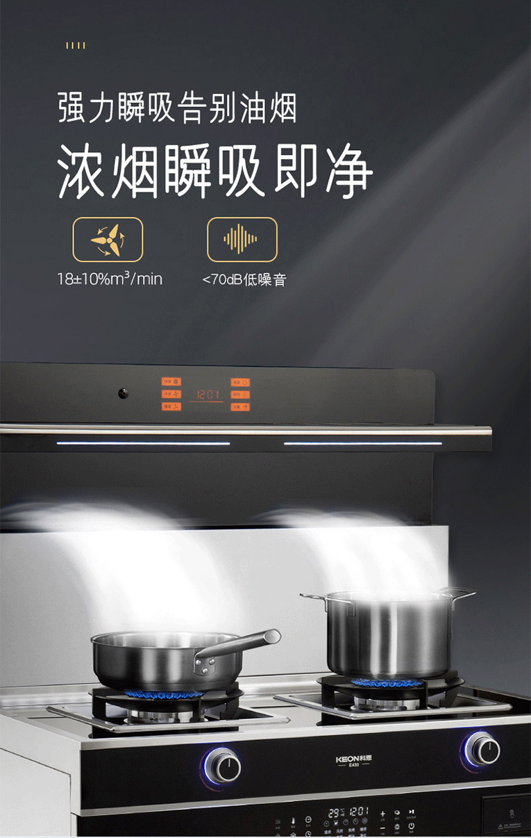 隨消費者對廚房油煙風險認識的提升,對于呼吸健康需求也得到了進一步的釋放,高效吸煙,隨心烹飪~科恩E430智能語音蒸烤消一體集成灶為消費者營造舒適烹飪環境,廚房油煙問題終將攻克,營造樂享智慧廚房新體驗!