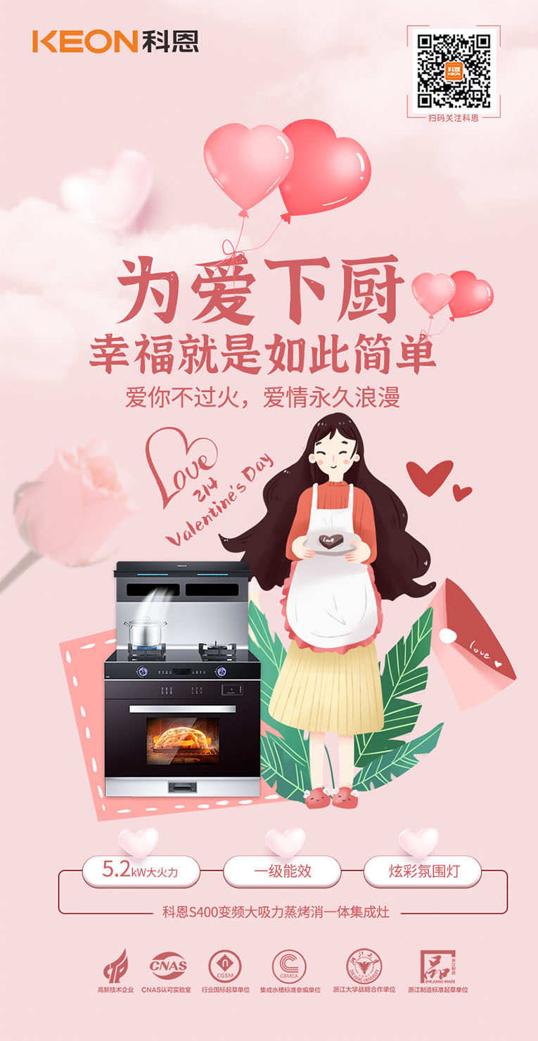 浪漫的情人節,給心愛的她一個小驚喜小浪漫,能想到最浪漫的事,就是和你一起慢慢變老,一起做很多頓飯~用人間煙火,治愈一身疲憊,一起吃飯是家庭生活最重要的儀式感。集成灶十大品牌、廚電行業十大品牌科恩S400變頻大吸力蒸烤消一體集成灶,蒸烤同步美味加倍,把更多美好時光留于家人,不必再囿于廚房,也能收獲美味與愛,讓你的時間慢下來。