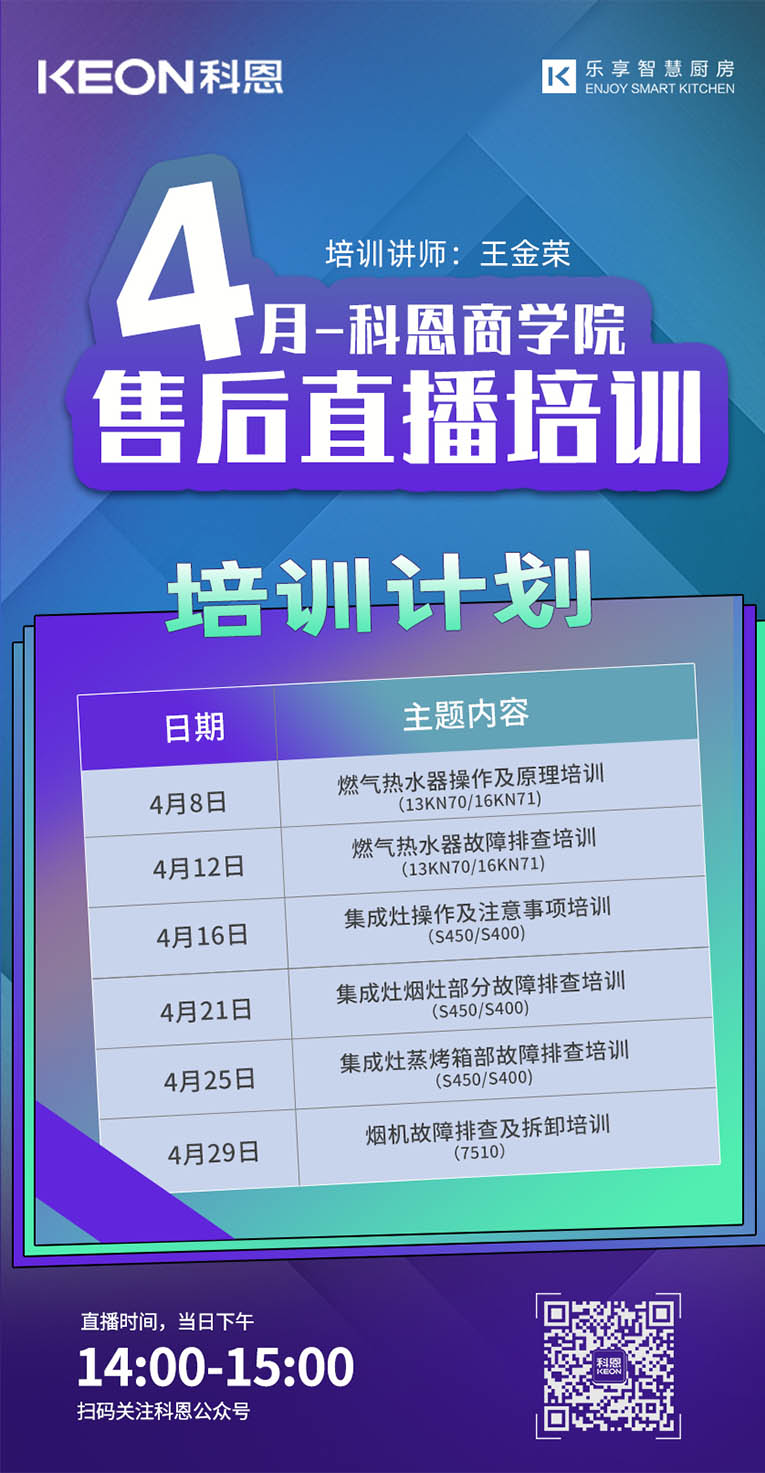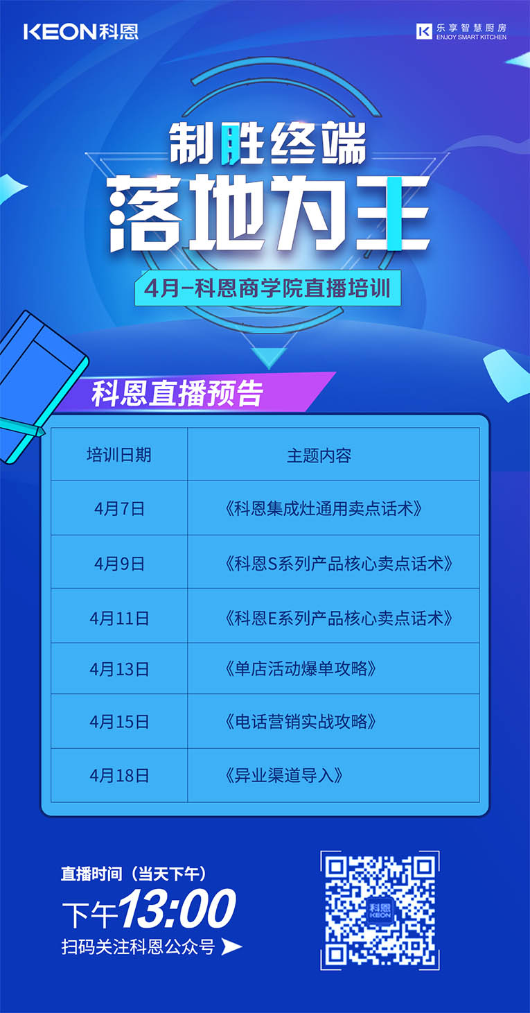勤修內(nèi)功,強(qiáng)化技能,提升自我!集成灶十大品牌、廚電行業(yè)十大品牌科恩集成灶4月線上直播培訓(xùn)總覽,儲備知識,保障團(tuán)隊(duì)凝聚力和戰(zhàn)力力,上下齊心,打造黃金團(tuán)隊(duì),擴(kuò)大品牌影響力!