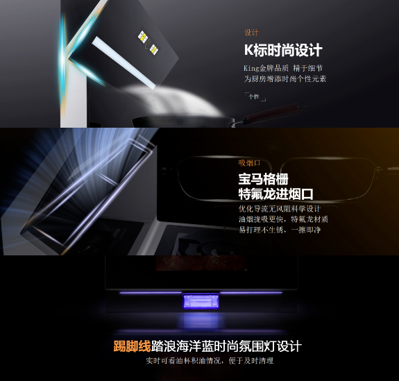 科恩C系列兩款王炸產品:C200消毒柜款集成灶、C260蒸烤消炸一體集成灶,在預熱期間就極具熱度,如今終于華麗登場,從外觀來看,此次的C系列完全顛覆了以往集成灶笨重且不夠美觀的形象,創造性的采用了企業標識“K”字型時尚機頭,寶馬經典格柵設計進煙口,以及踏浪海洋藍時尚氛圍燈底座設計,盡覽奢美,構筑視覺與觸覺的全新想象,一眼,鮮明,再睹,目不轉睛!