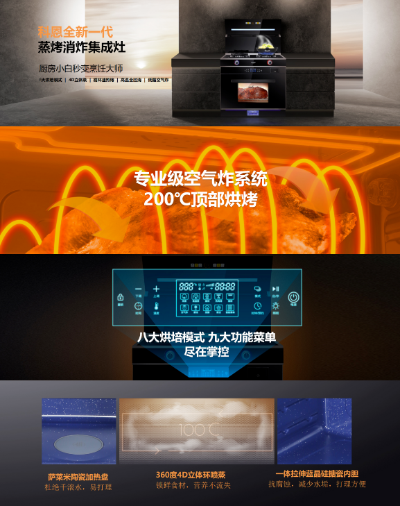 除了在外形上的顛覆常規、以型造境之外,C系列集成灶在功能實用上的優勢也可圈可點,以C260蒸烤消炸集成灶為例,集鮮蒸、嫩烤、消殺、空氣炸于一體,美味健康四合一。八大烘焙模式、九大功能菜單、4D立體蒸、循環速熱烤、高溫全腔消、低脂空氣炸,自動烹飪,輕松上手,一臺科恩C260集成灶頂得了一個專業級烹飪大師,實在令人心動!
