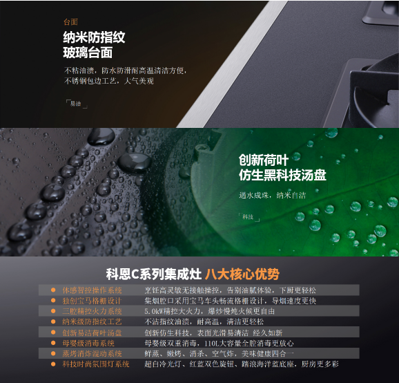 值得一提的是科恩C系列集成灶在用戶最為犯難的清潔打理方面也頗為用心,全系采用納米防指紋玻璃臺面,不沾油漬,防水防滑耐高溫,清潔尤為便捷,臺面四周為不銹鋼包邊工藝,不僅外觀美觀大氣,而且可以有效防止湯汁滲漏滴落至地面,從而杜絕滑倒等意外情況的發生。另外,湯盤采用的是創新荷葉仿生黑科技湯盤,納米自潔,滴油不沾,遇水成珠!不難想象,在擁有如此黑科技的集成灶上烹制美食,該是一種多么難以言喻的放松和愜意!
