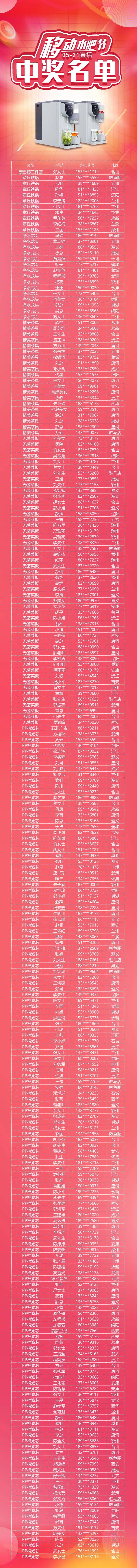 什么?聽說科恩移動水吧節(jié)不僅能15天免費體驗一臺頂九臺的集成式凈水器,還能參與直播抽獎,而且還是100%中獎,科恩電器也太壕氣了吧!!!科恩移動水吧節(jié),誓讓國人喝好水,全國免費體驗活動正在火熱進行中,重磅政策與誠意豪禮,免費體驗,產品始終如一。為回饋消費者,科恩移動水吧節(jié)直播抽獎活動順利舉行,凡參與免費體驗活動即可抽取獎品,實力寵粉,100%中獎!抽獎名單公示如下: