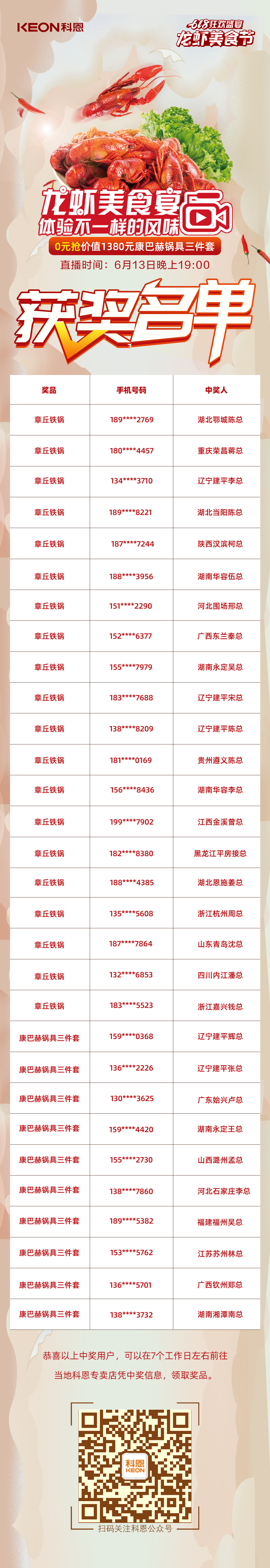 為回饋消費者的支持與厚愛,科恩集成灶實力寵粉,不僅推出線下龍蝦美食宴活動,更有多輪線上大抽獎活動。這么精彩的龍蝦美食節直播活動,你參與了嗎?1元薅羊毛的機會你搶到了嗎?快來看看這期中獎名單,有你嗎?
