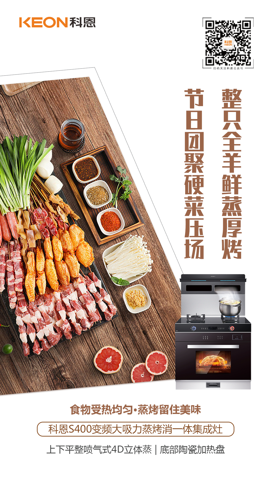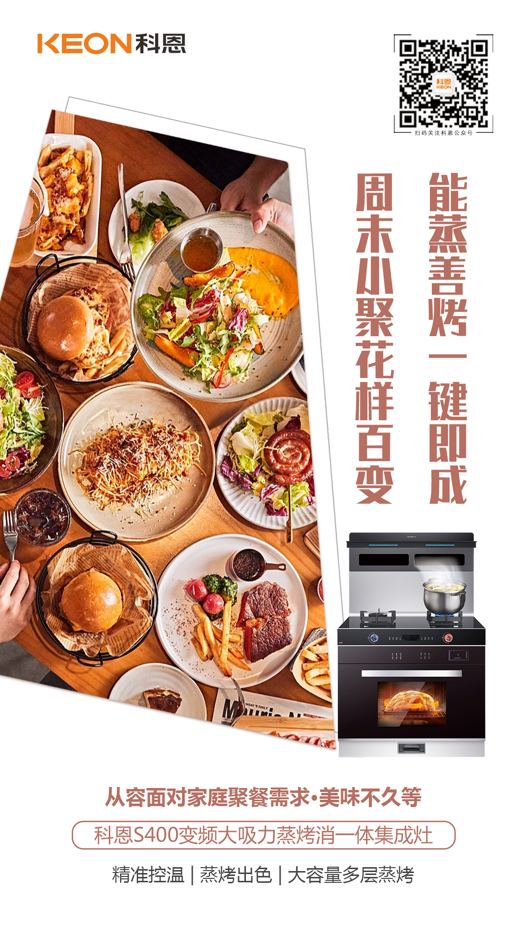 驅(qū)散夏日炎熱,讓夏天愛上下廚房,用科恩S400變頻大吸力蒸烤消一體集成灶,文蒸武烤,美味即刻上桌!