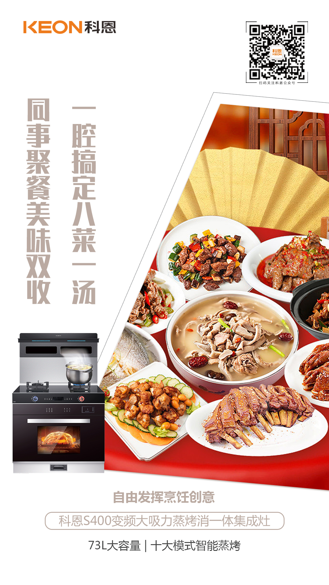 親友聚餐,想露一手奈何卻是廚房小白,是時候打開科恩S400, 享受一下“廚藝大師”的主角光環(huán)了!73L大容量可視腔體,從容面對家庭聚餐需求,一腔搞定八菜一湯,十大模式智能蒸烤,自由發(fā)揮烹飪創(chuàng)意,火候、溫度、時間,一鍵搞定!
