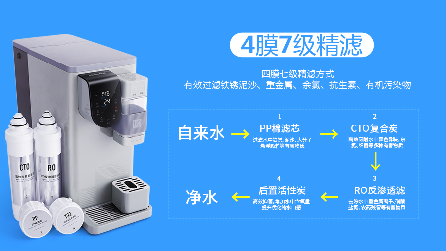那么,怎樣才能最大限度的減少水中的雜質及污染物呢?安裝一臺優質的凈水器勢在必行!而且一定要裝有RO反滲透過濾裝置,過濾精度高,去除有機污染物、重金屬都不在話下,不僅能讓污染的水得到有效的過濾處理,而且還不用改線改管道,就能快速便捷的飲用干凈健康的水!