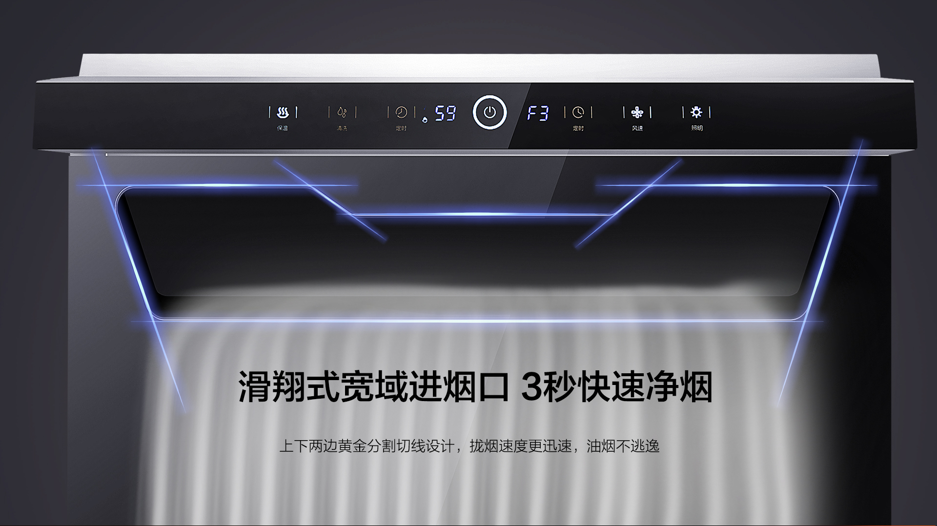 ◆上下兩邊黃金分割切線設計,搭載低空近吸技術,緊鎖升騰油煙不上臉,攏煙速度更迅速。