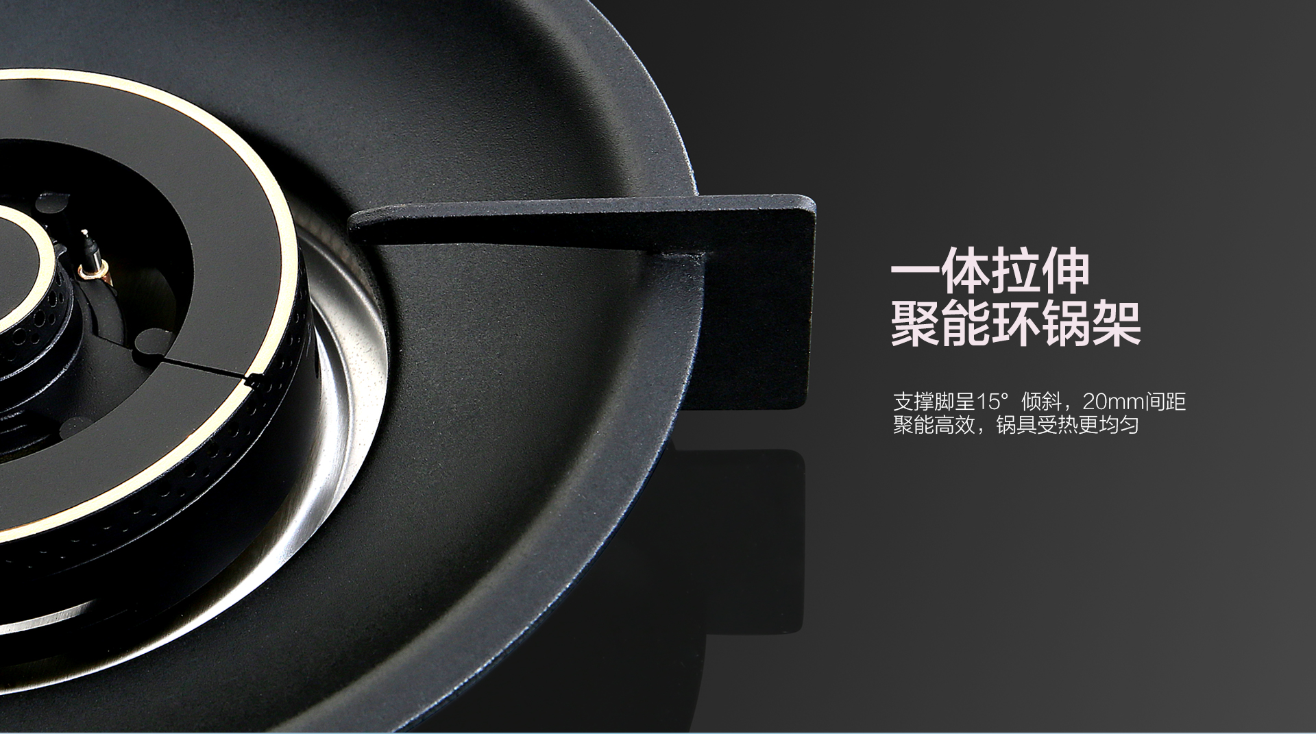 ◆一體拉伸聚能環鍋架,支撐腳呈15°傾斜,20mm間距,聚能高效,鍋具受熱更均勻!