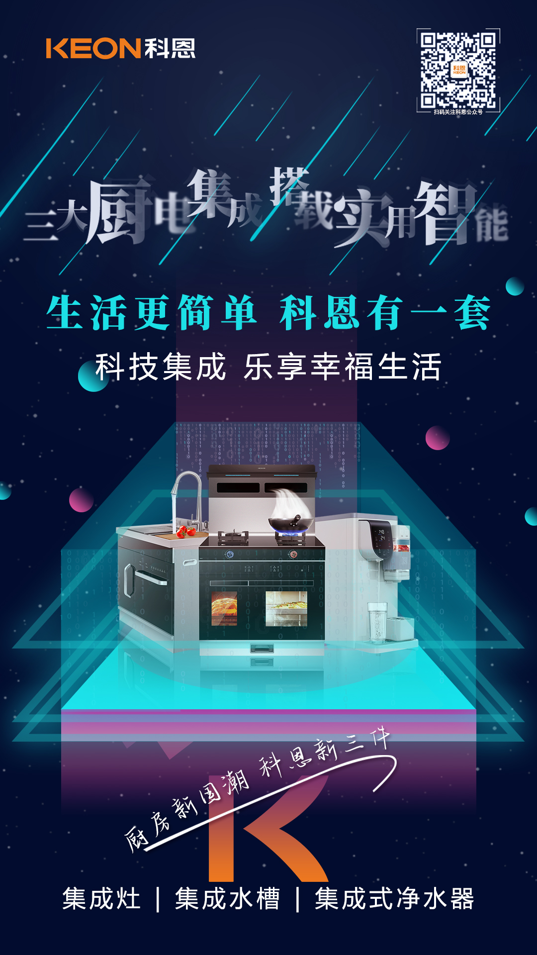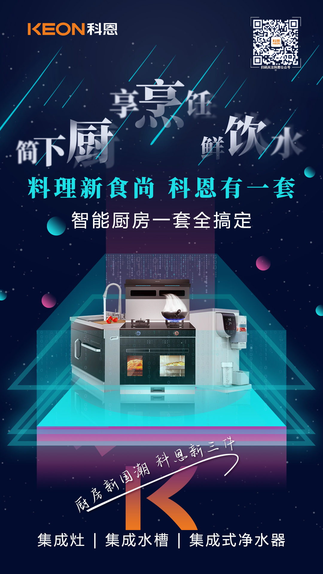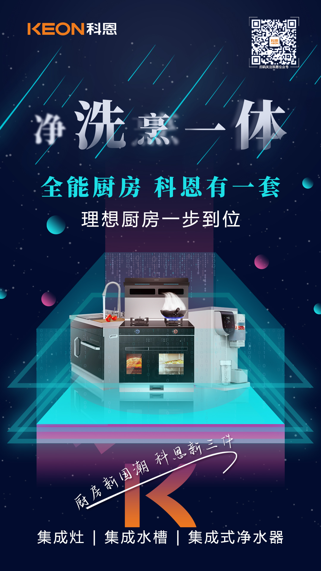 為此,科恩集成灶延續(xù)“樂(lè)享智慧廚房”理念,立足創(chuàng)新,大膽突破固有思維定式,跳出單品同質(zhì)化現(xiàn)狀,勾勒出了“廚房新國(guó)潮,科恩新三件”為主題的未來(lái)廚房場(chǎng)景——以集成灶為代表的“烹”為中心、以集成水槽洗碗機(jī)為代表的“洗”為中心、以集成式凈水器的“飲”為中心,整合了科恩電器全系產(chǎn)品資源,構(gòu)建多層次、全體系的廚房體驗(yàn),為用戶提供更立體、更豐富的廚房解決方案!