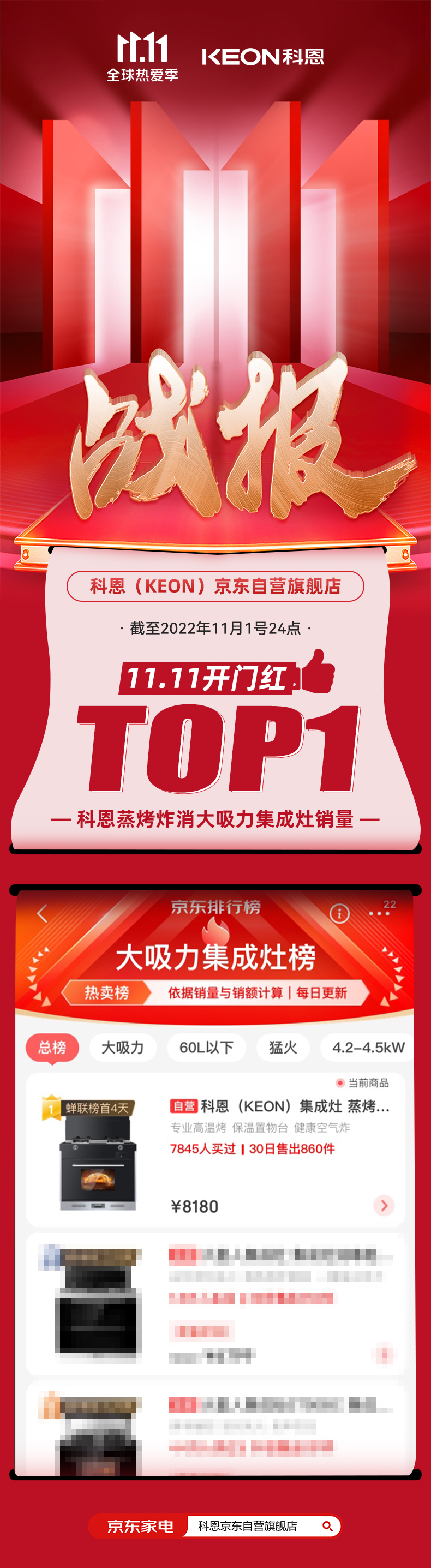 科恩雙11開(kāi)門(mén)紅戰(zhàn)報(bào)正式出爐,截止2022年11月1日24點(diǎn),雙11開(kāi)門(mén)紅開(kāi)搶28小時(shí),科恩集成灶榮登大吸力集成灶榜TOP1,實(shí)力登榜,權(quán)威見(jiàn)證!