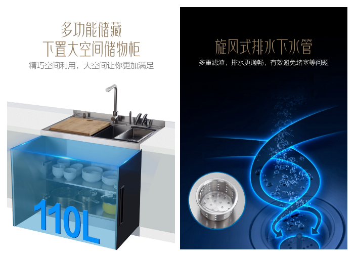 旋風式排水下水管,多重濾渣排水更通暢,ABS防臭下水器套裝設計,耐凍裂防冷凝,有效保護了櫥柜不受損傷。