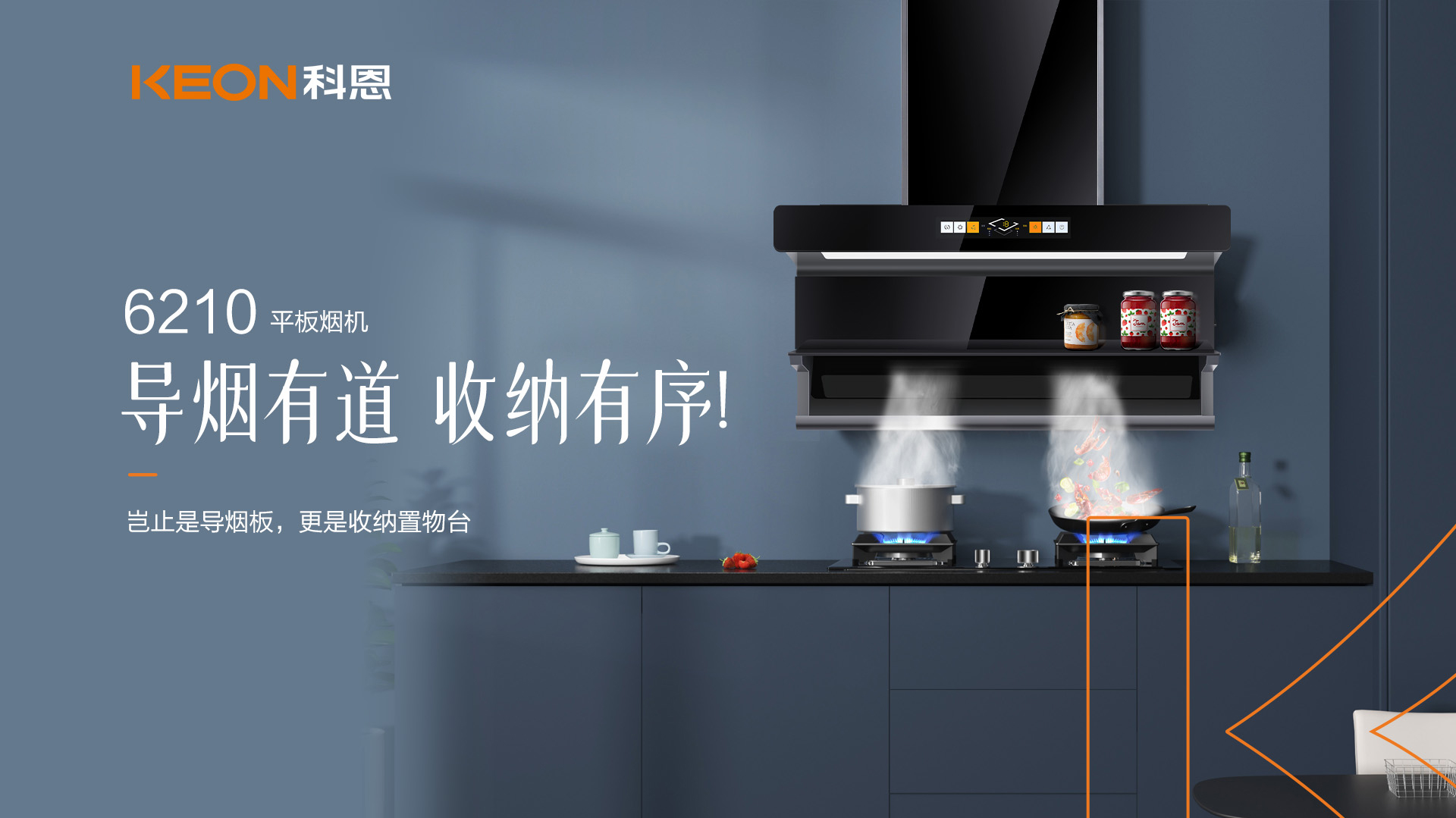科恩平板煙機6210降低吸煙距離,采取低空爆吸,讓油煙在鍋口就被吸走!特制的導煙置物板,更是阻絕油煙向上跑的可能,徹底做到油煙不過臉。且在導煙同時,還能置物,烹飪時隨手置放的調味品有了好去處!
