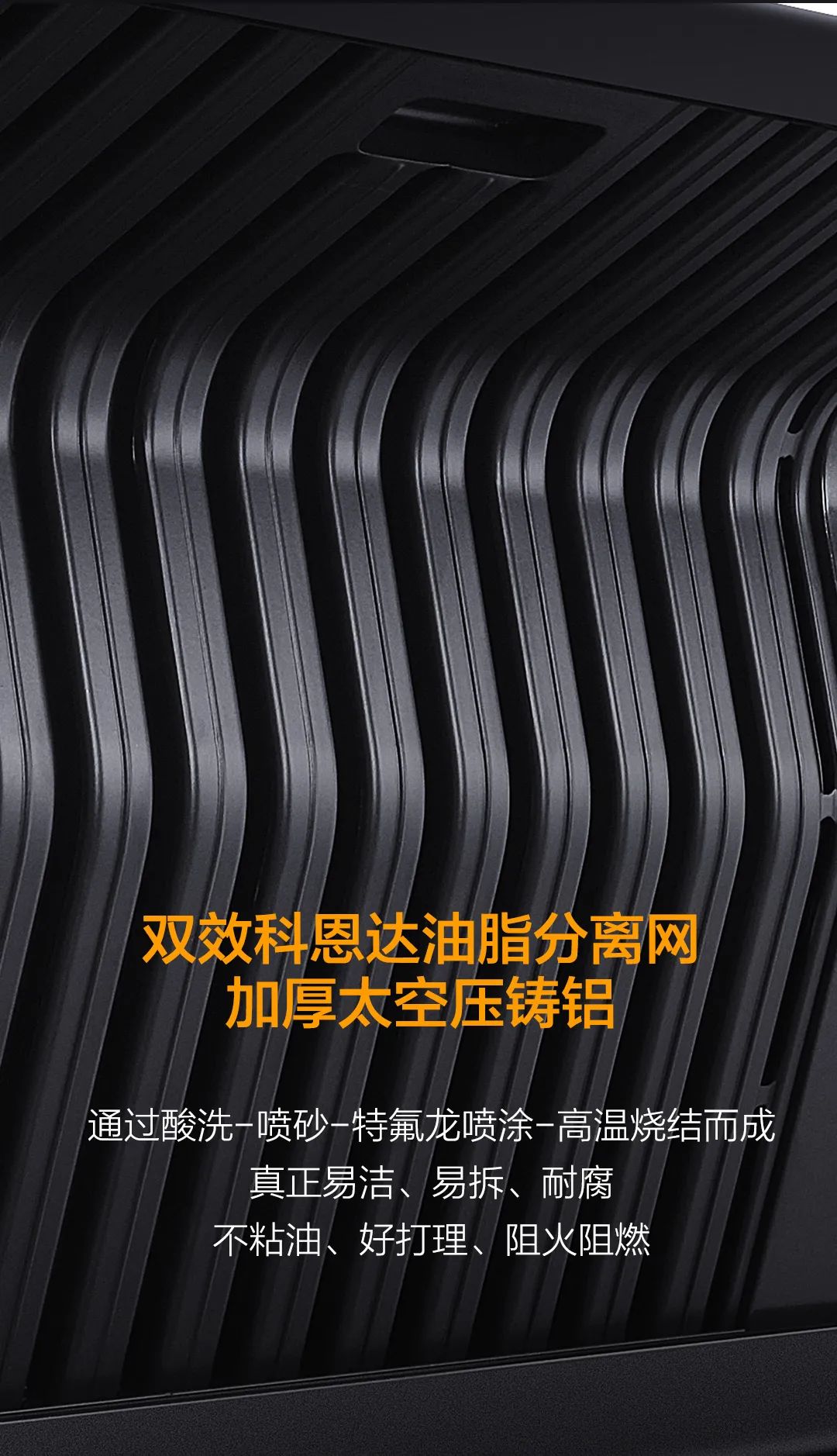 在工藝上經(jīng)過酸洗-噴砂工藝加之特氟龍噴涂最后高溫?zé)Y(jié),不僅不沾油、易清潔好打理。在分離油煙的同時,還能阻燃阻熱!保障廚房安全!