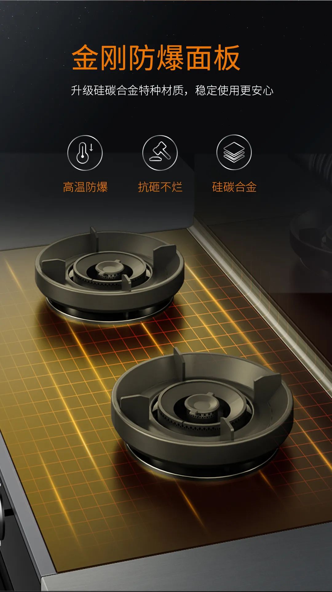 6K省心超體驗(yàn)一:抗砸防爆耐高溫,安全省心!防爆免清洗集成灶采用防爆金剛板解決廚房安全隱患!硅碳合金特種材質(zhì)可耐高溫1500℃,高于國(guó)標(biāo)3倍以上,更安全!