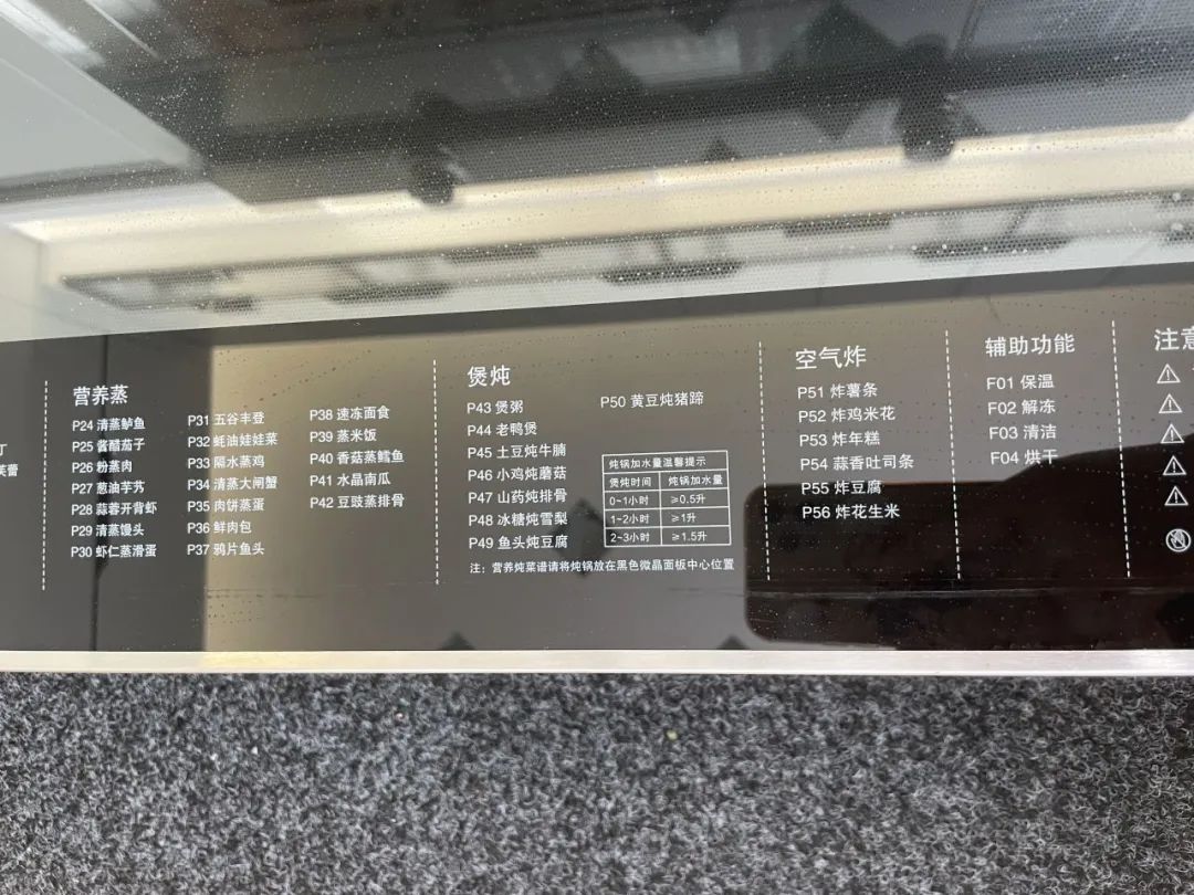 在蒸箱門(mén)板上我們能看到有56道菜肴,內(nèi)置菜譜,可一鍵開(kāi)啟相應(yīng)的蒸烤炸燉功能,無(wú)需調(diào)節(jié)時(shí)間、溫度,即使小白也能當(dāng)大廚。