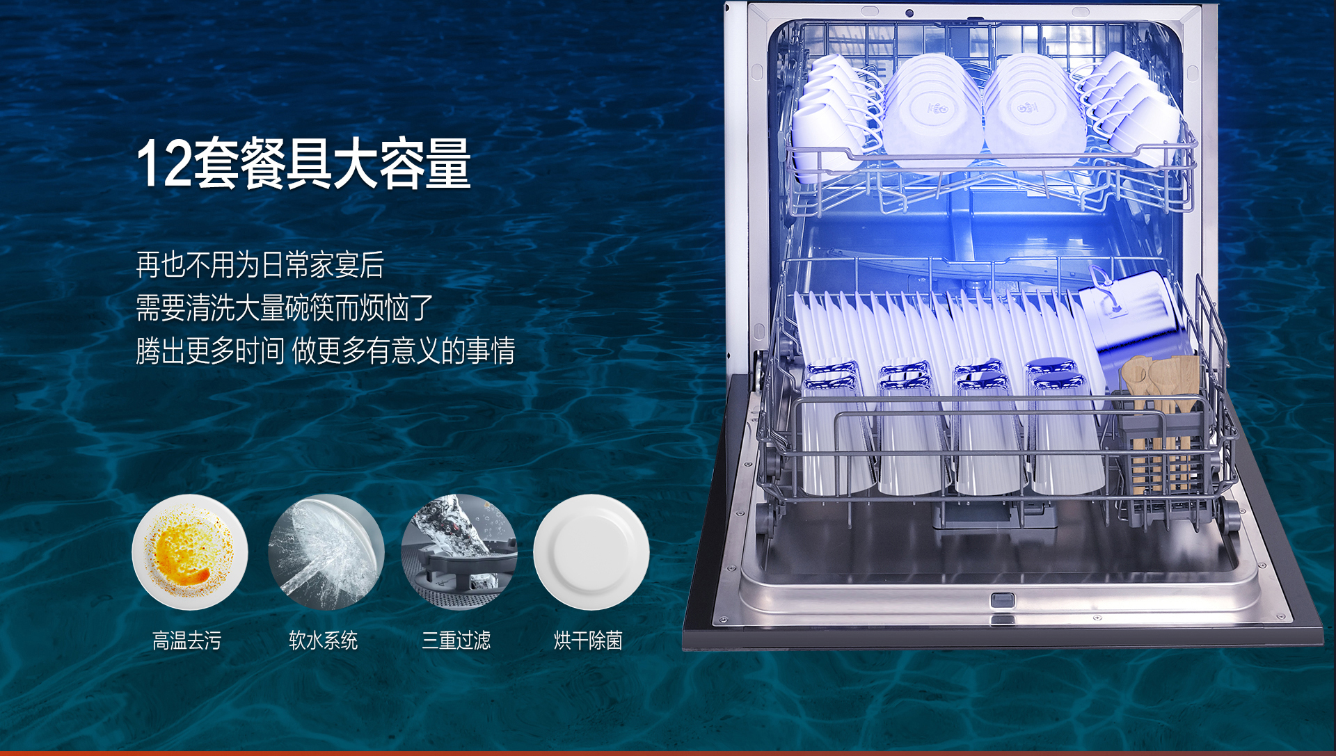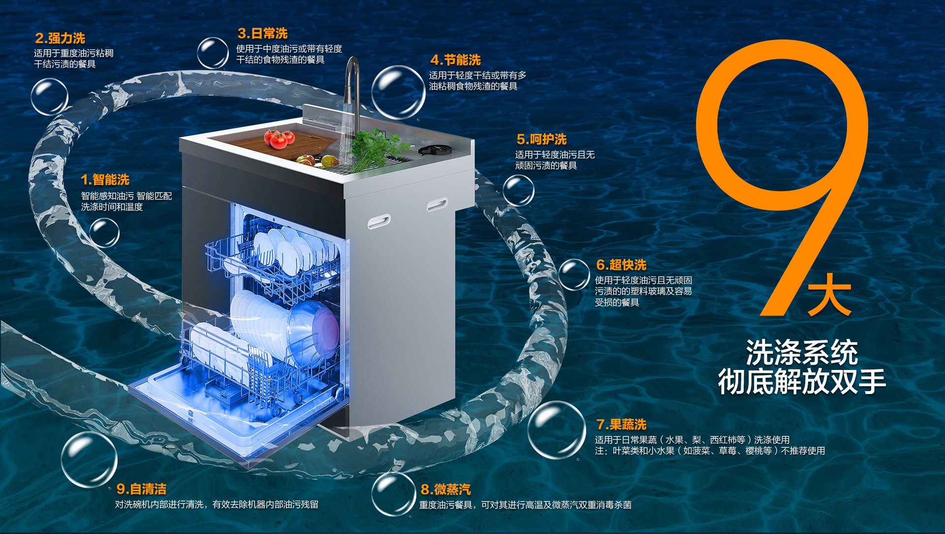 一臺頂五臺:水槽、洗碗機、果蔬凈化器、消毒柜、櫥柜融為一體,1平米就足以解決廚房清洗難題。