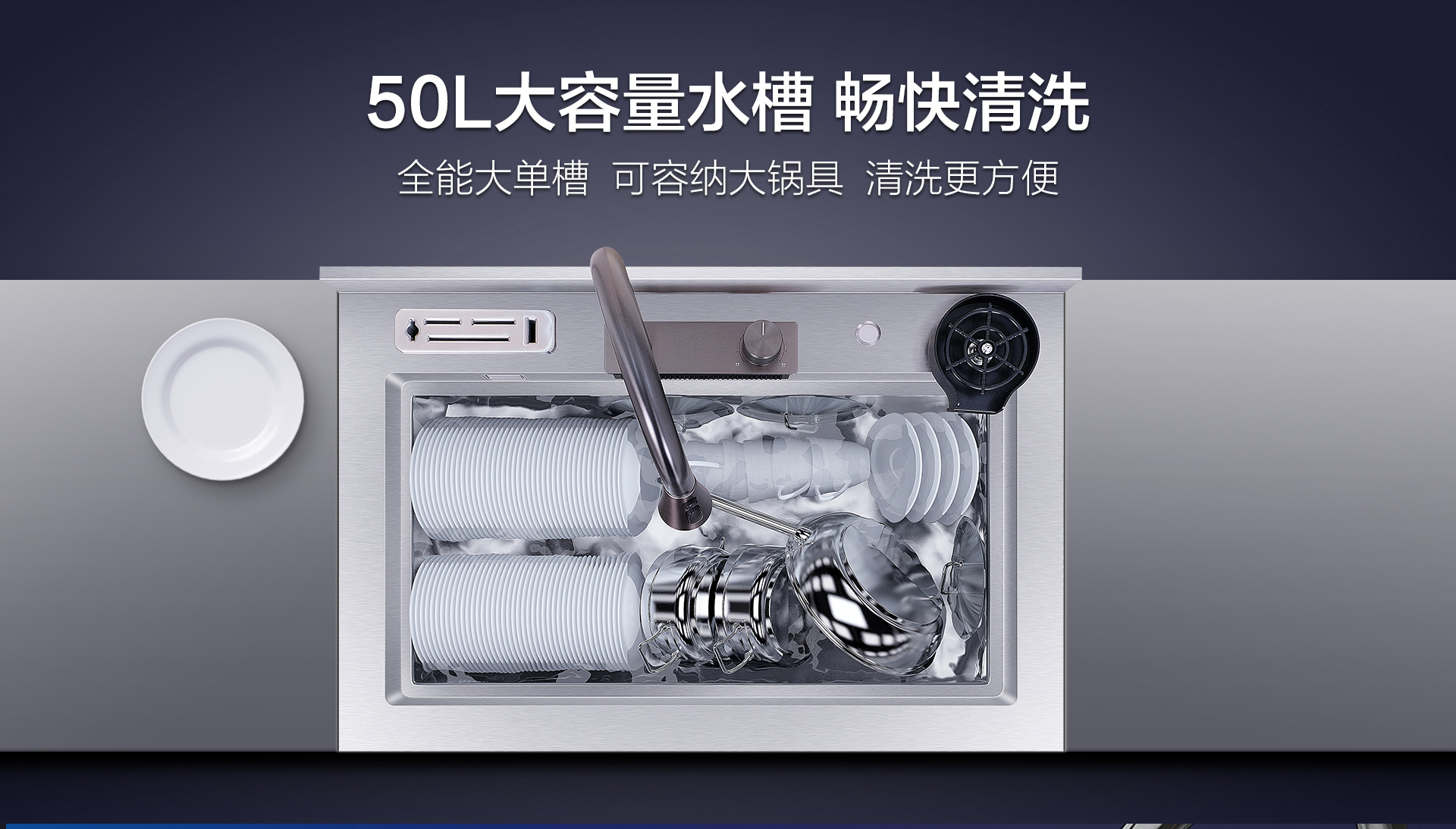 50L大單槽徹底告別鍋具放不下的煩惱,隨心清洗更舒心。飛雨瀑布水幕清洗蔬果更輕松。