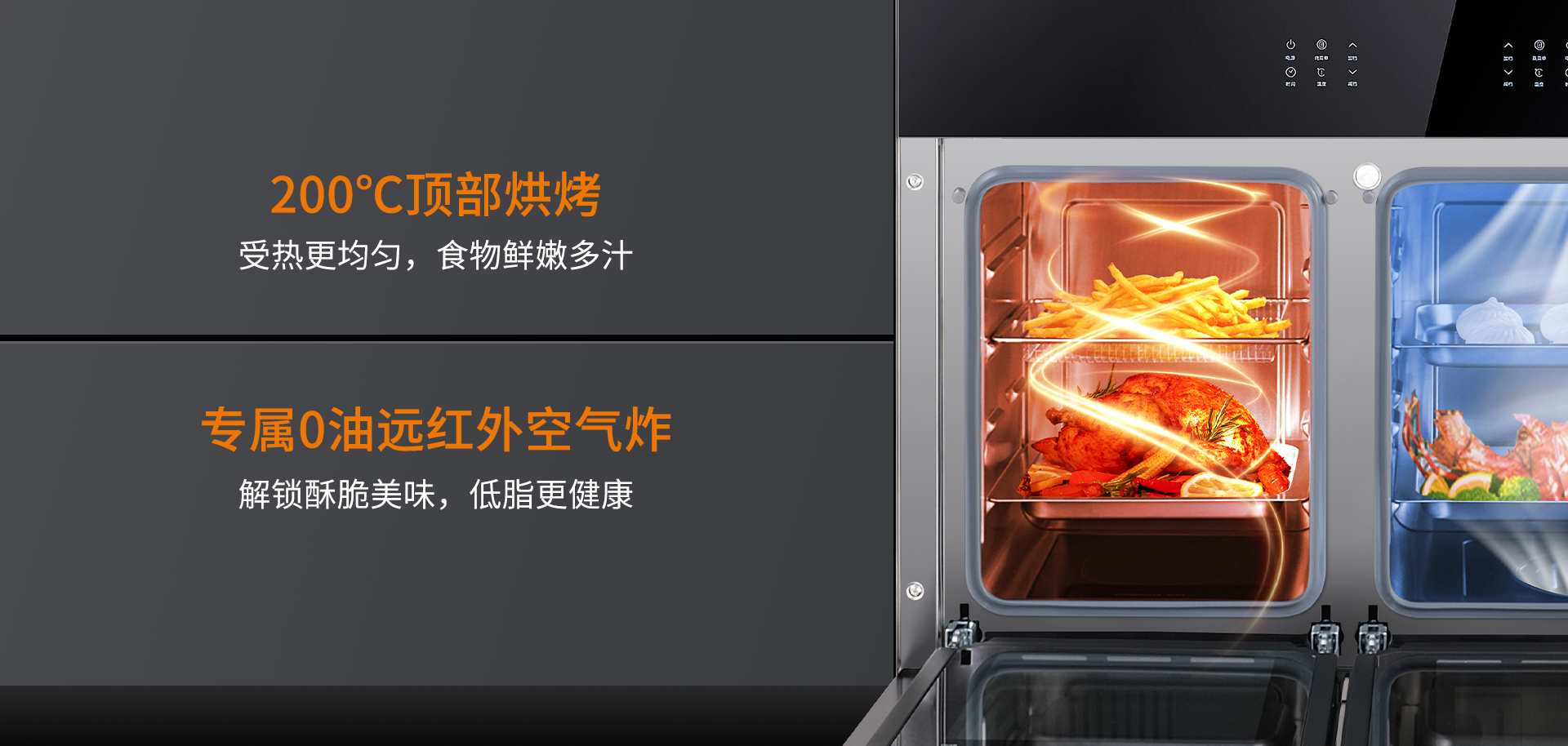 S450L采用200℃頂部烘烤,讓食材受熱更均勻,保障食材鮮嫩多汁,烤的有滋有味!同時,還配有0油遠紅外空氣炸,無油更健康,解鎖酥脆美味。