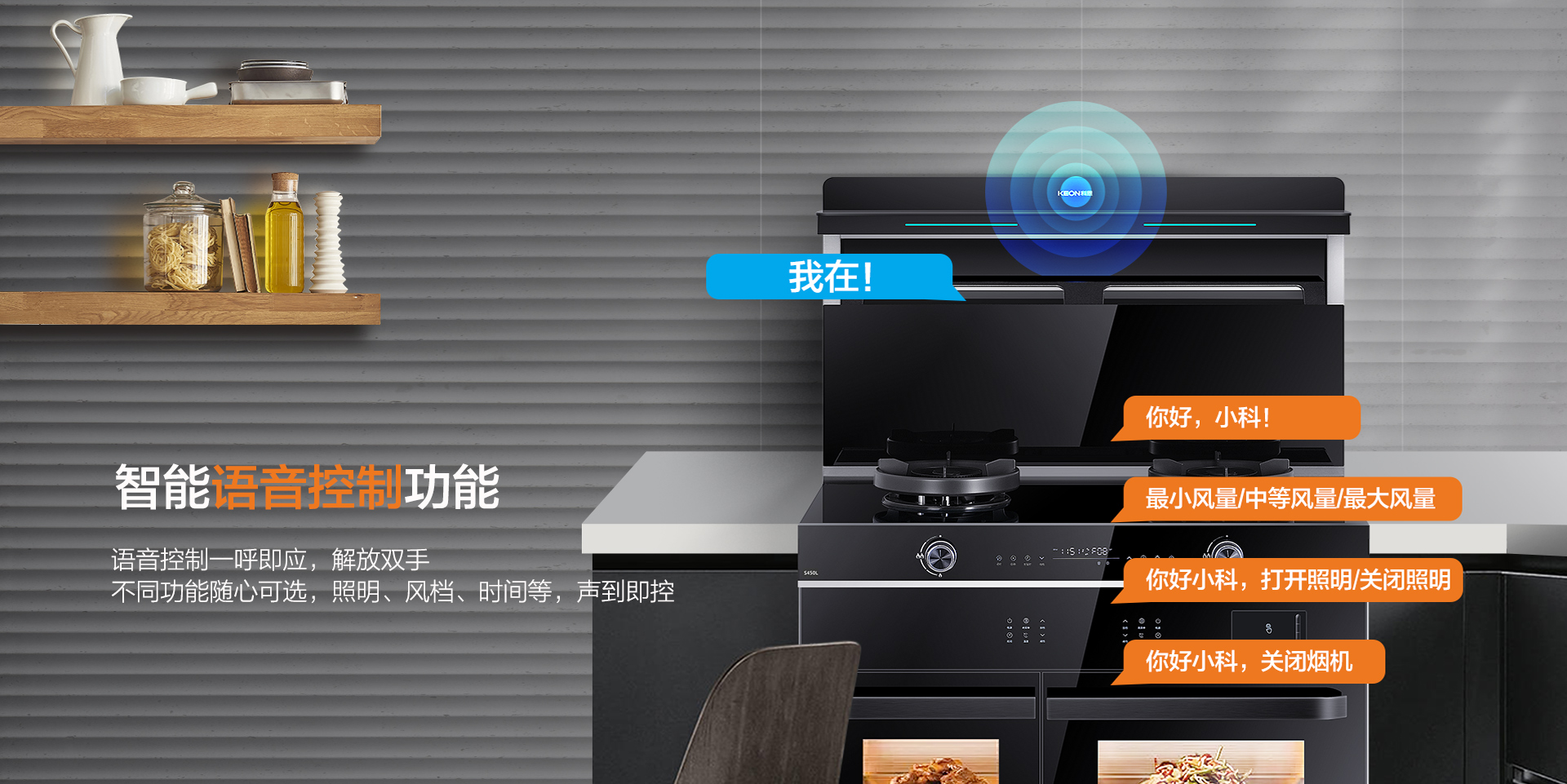 S450L搭載語音喚醒功能,只需開口就能控制集成灶,盡顯廚房黑科技。