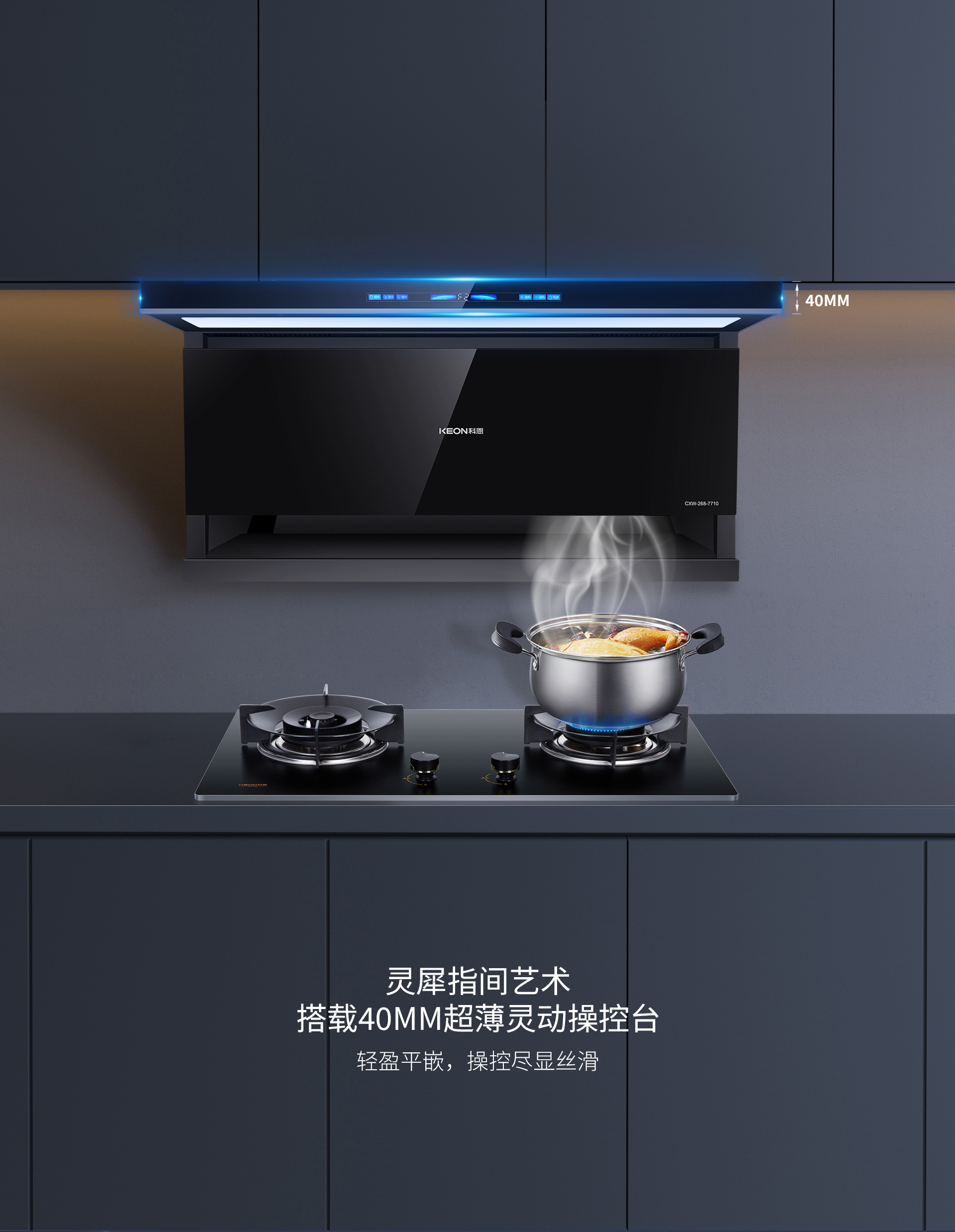 科恩7710智能聯動煙機,它所代表的不僅僅是技術層面的高度突破,更是對美好廚房體驗矢志不渝的追求。其獨特的設計靈感,仿若來自浩瀚銀河星際。那深邃藍光跨弧意境的觸摸屏設計,為烹飪增添了無限想象空間,讓每一次操作都如同在星際間穿梭,充滿了科技與藝術的交融之美。