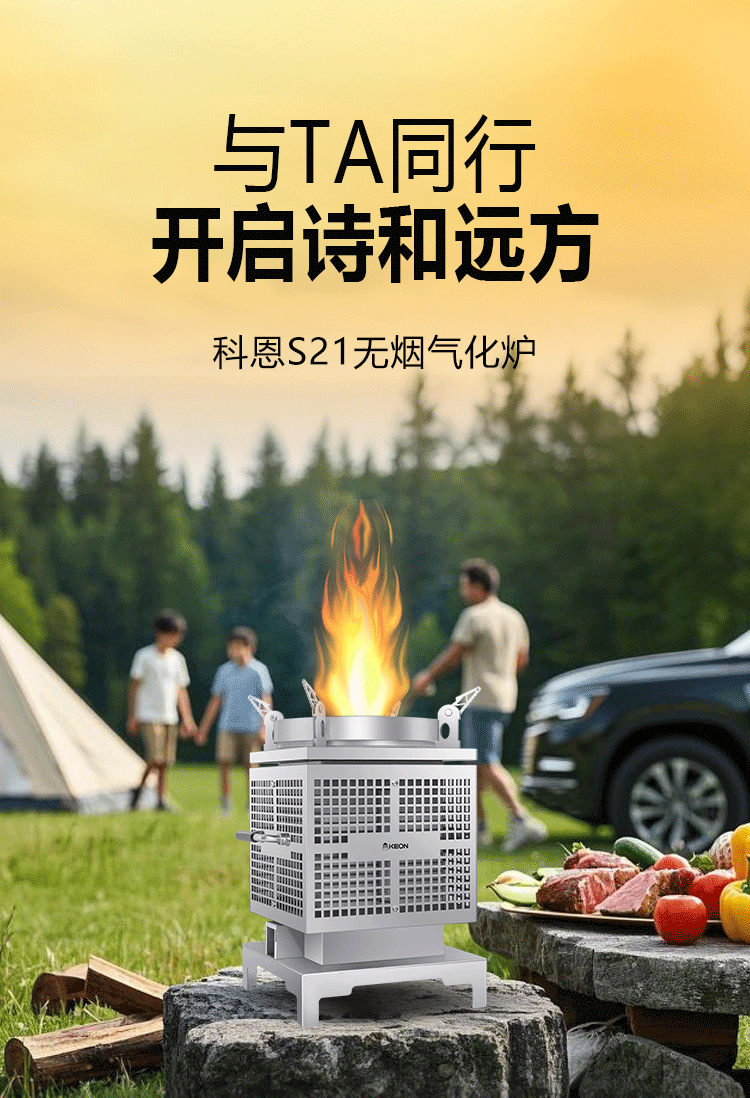 科恩無煙氣化爐S21,無煙環保,節能高效。以科技之名,守護山野呼吸的純凈留存人間煙火的溫度來一場說走就走的露營,享受春日暖陽和自然野趣。科恩,讓戶外烹飪更無憂,無煙氣化爐S21新升級,搭配12500RPM高轉速風機,無極調速,控火隨心。‌一切物體皆可燃‌,枯枝落葉化身燃料!