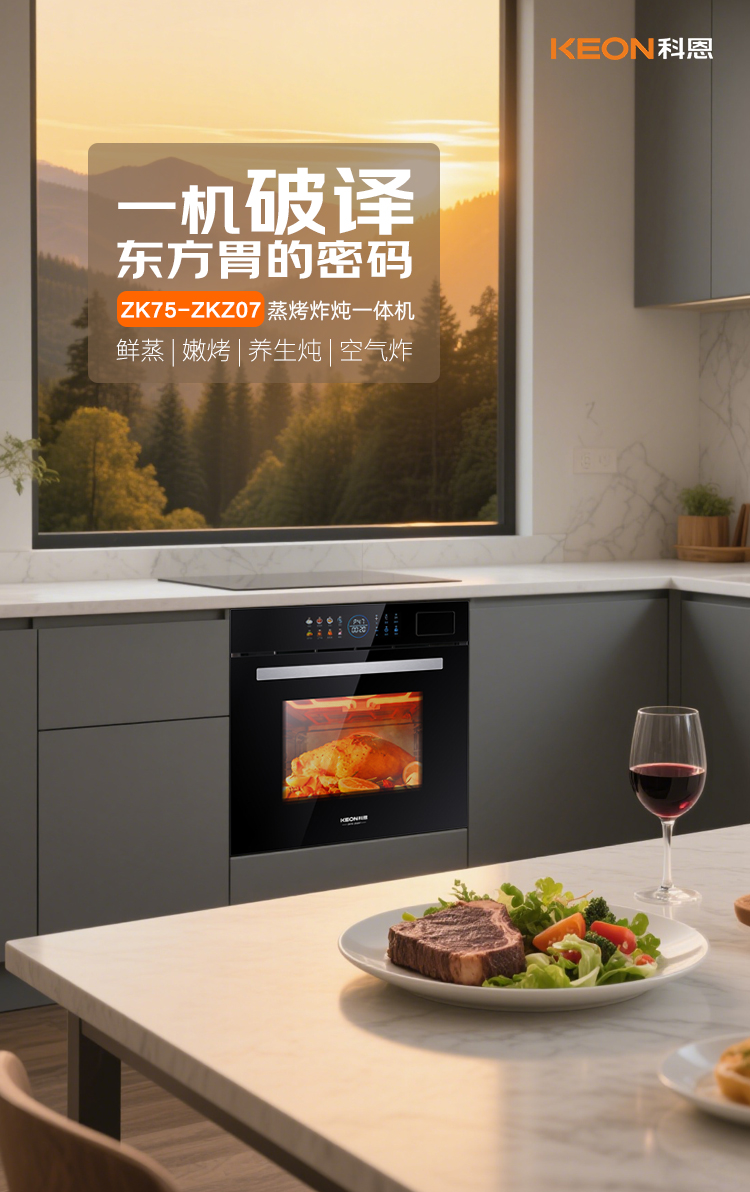 夏意漸濃,煙火煥新科恩全新打造蒸烤炸燉一體機ZKZ07以科技之力,一機破解東方胃的密碼,讓蒸汽縈繞、脆香迸發、炙烤生香重構一方煙火里的味覺宇宙