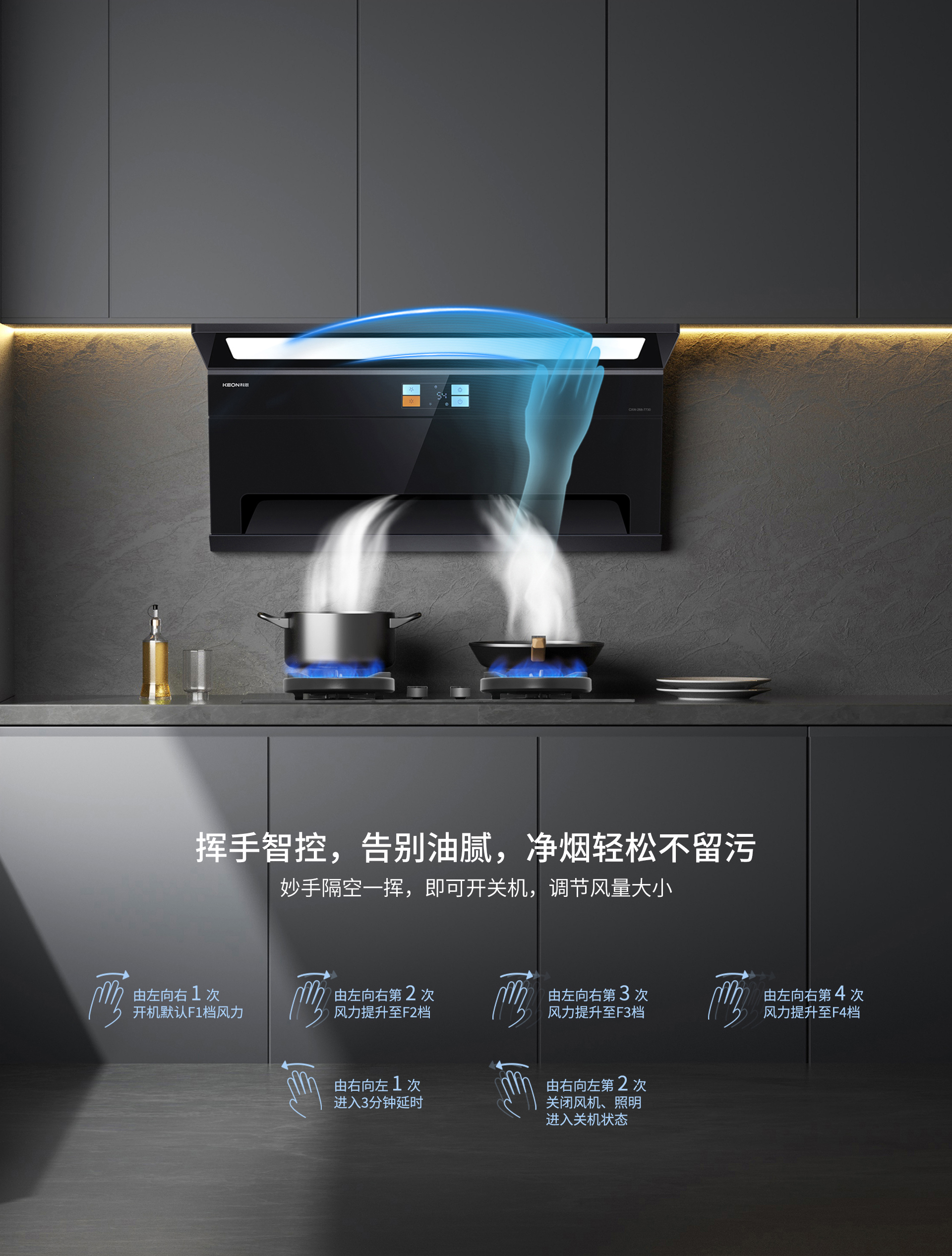 智能操控,告別油膩接觸。揮手即能掌控,雙手不沾油污,隔空一揮開(kāi)關(guān)機(jī)、調(diào)風(fēng)量,模塊化彩屏觸摸鍵,老人也能輕松操作,煙灶聯(lián)動(dòng),火起煙凈,打造智能便捷的廚居生活。