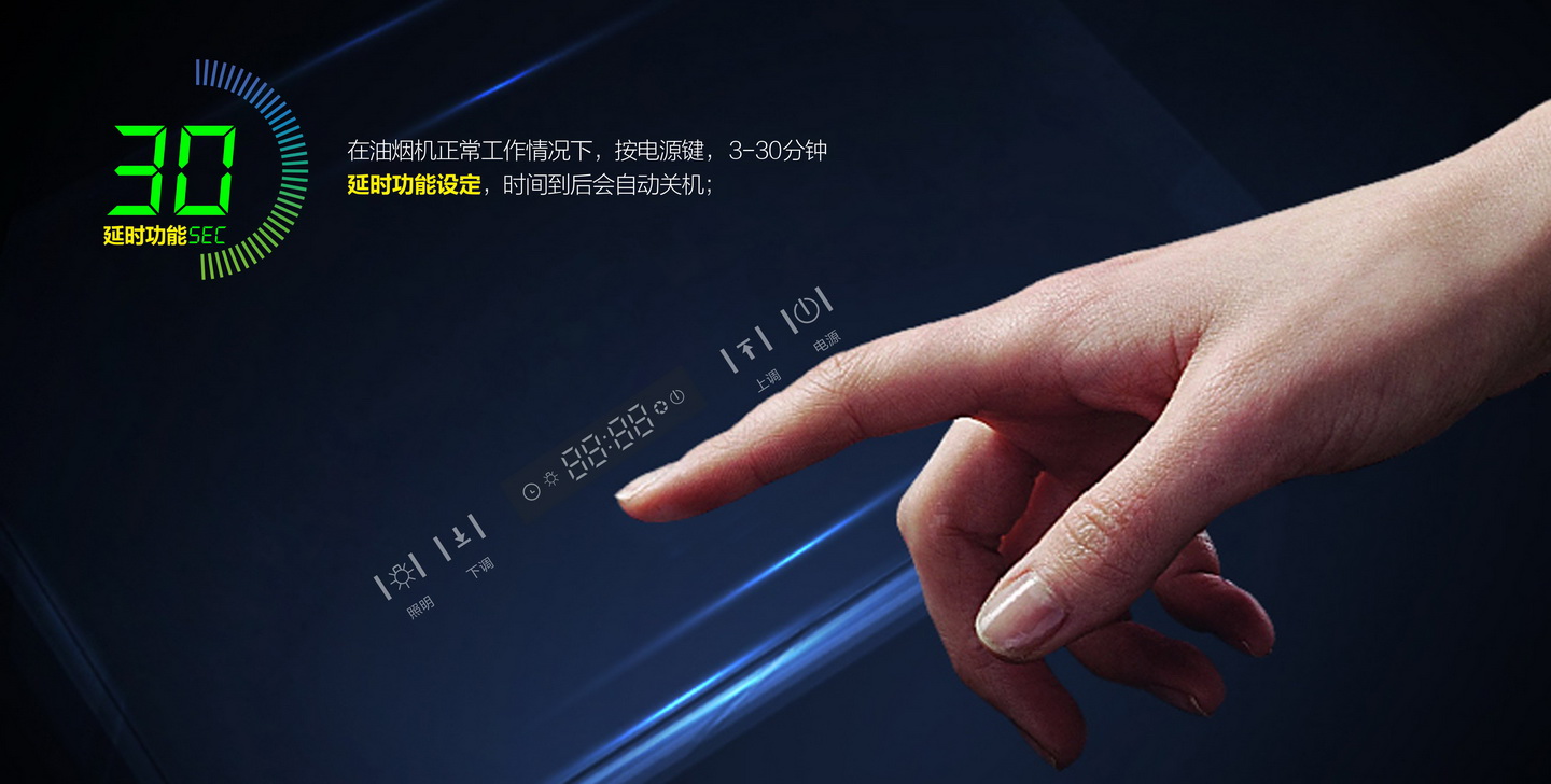 在油煙機(jī)正常工作情況下,按電源鍵,時間到后會自動關(guān)機(jī)。