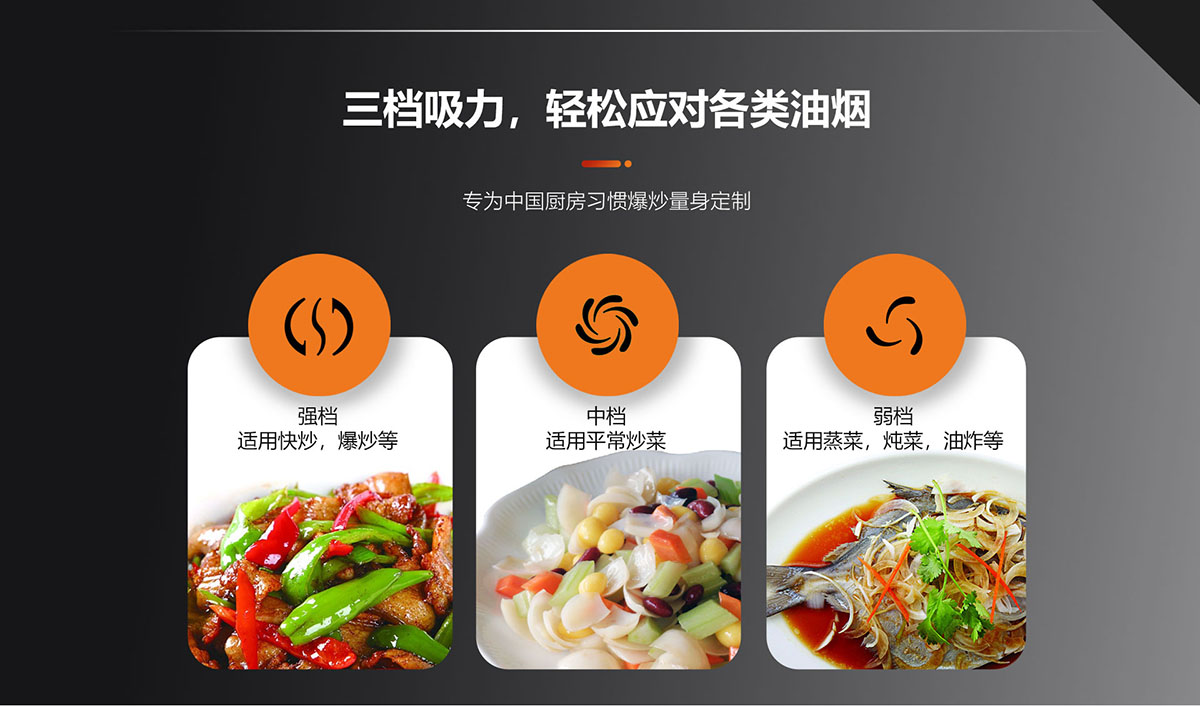 三檔吸力,輕松應(yīng)對(duì)各類(lèi)油煙,專(zhuān)為中國(guó)廚房習(xí)慣爆炒量身定制