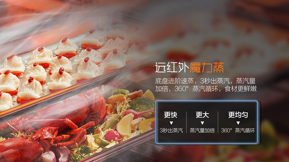 - 遠(yuǎn)紅外魔力蒸,底盤進(jìn)階速蒸,360°蒸汽循環(huán),3秒出蒸汽,鎖鮮食材
