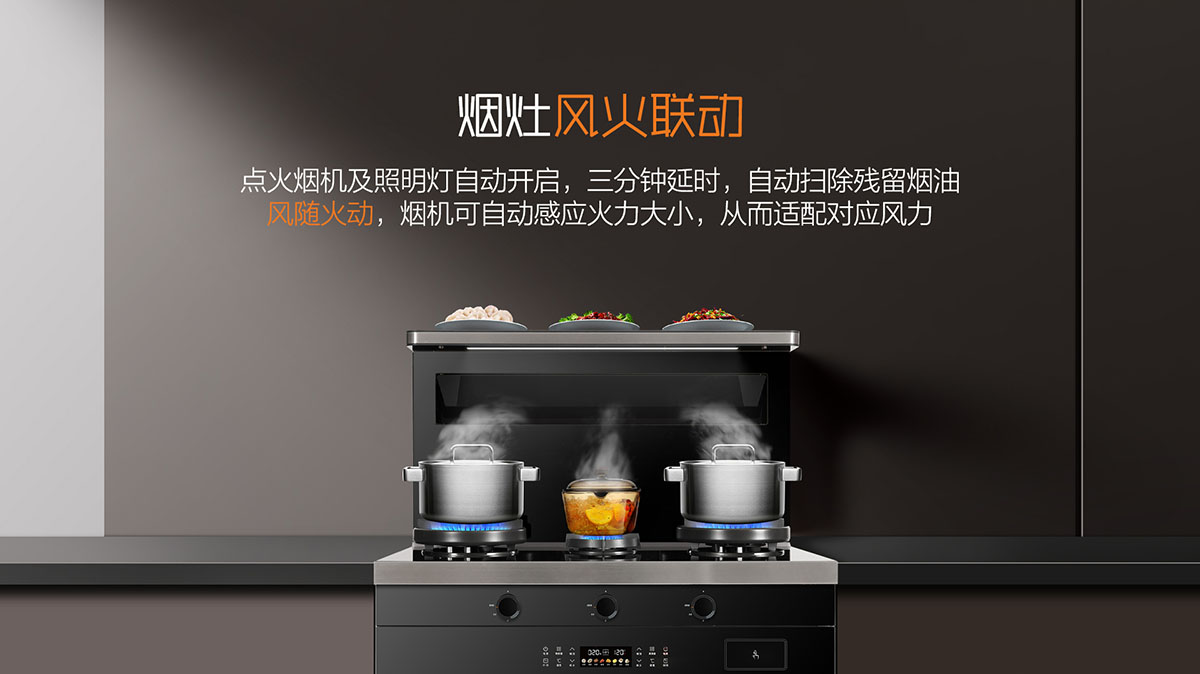 - 煙灶風(fēng)火聯(lián)動(dòng),點(diǎn)火煙機(jī)自動(dòng)開啟,風(fēng)量隨火力大小自動(dòng)調(diào)節(jié)